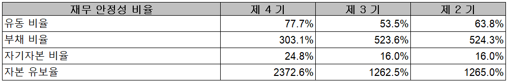 2021년 말 재무 안정성 비율에서는 유동비율 77.7%, 부채비율 303.1%, 자기자본비율 24.8%, 자본 유보율 2,372.6%를 기록했습니다. 아라미드 및 탄소섬유 등 신규 사업에 지속적인 투자를 하면서 당기 중에는 부채 규모의 증가보다 자산의 증가 폭이 커지면서 부채비율이 감소하였습니다. 또한 코로나19 팬데믹에서 벗어나면서 2021년부터 꾸준한 영업 실적이 예상되어 재무 상태의 호전도 이어질 것으로 전망합니다.