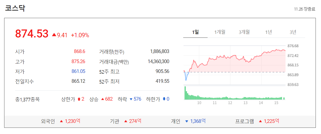 오늘 코스닥은 전 거래일 대비 9.41포인트(1.09%)오르면서 다시 870선에 안착했습니다.
