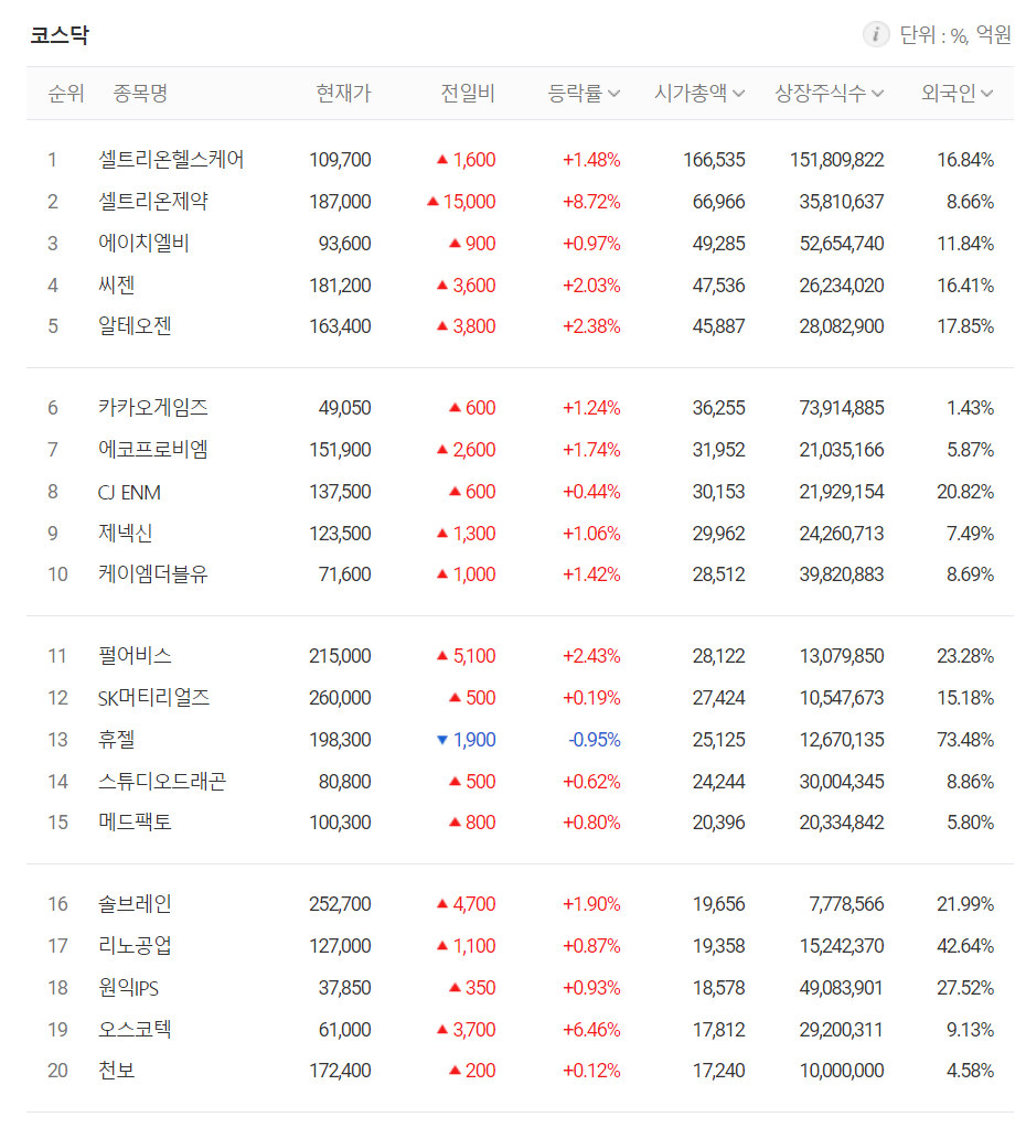 시가총액 상위 종목 20개 종목 중 셀트리온헬스케어(+1.48%), 셀트리온제약(+8.72%), 에이치엘비(+0.97%), 씨젠(+2.03%), 알테오젠(+2.38%) 등 상위 10개 종목 모두 상승했습니다.