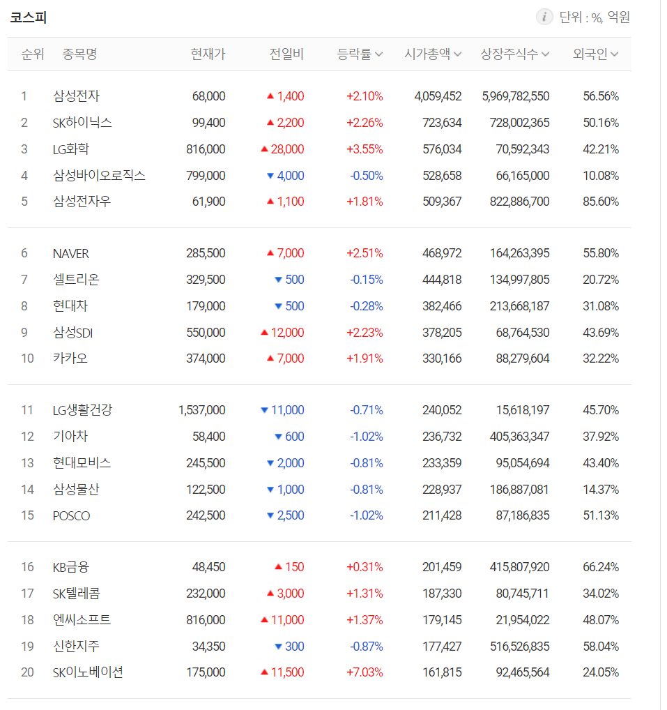 오늘 시가 총액 상위 종목에서는 삼성전자가 2.10% 오르면서 68000원에 거래되면서 신고가를 기록했고, LG화학은 3.55% 오른 816000원에 마감하면서 80만 원 대 진입을 했습니다.