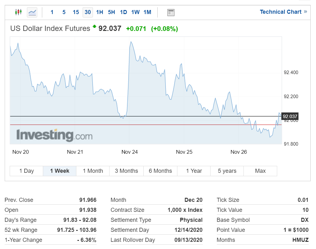 미국 달러 인덱스 선물도 하락세를 보이면서 현재 92.037포인트를 기록 중입니다.