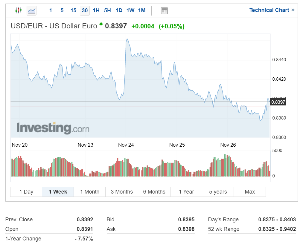 달러 대비 유로 환율은 1달러당 0.8397유로를 기록 중입니다.