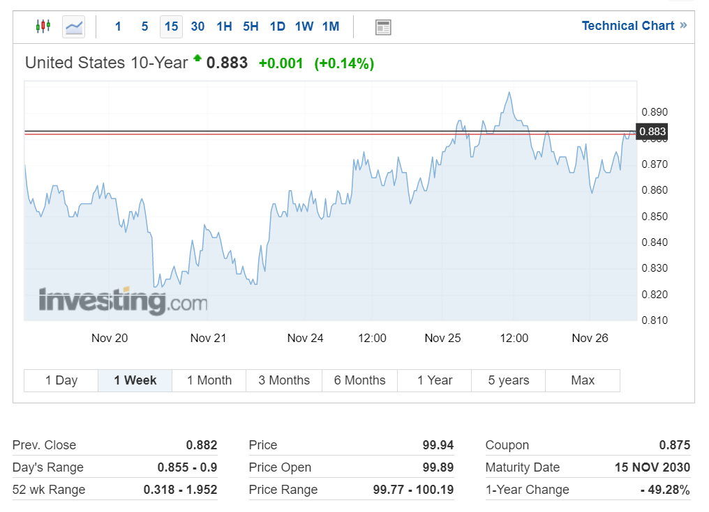 미국 국채 10년 물 금리는 소폭 상승하면서 현재 0.883을 기록 중입니다.