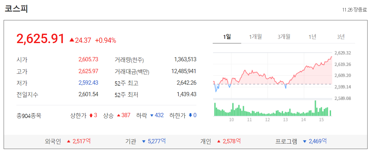 오늘 코스피는 외국인과 개인의 동반 매수에 이틀 만에 사상최고치를 경신하면서 24.37포인트(0.94%) 오른 2625.91에 장을 마감했습니다.