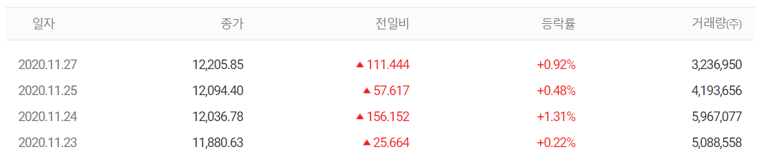 코스피 시가총액 상위 종목 마감 시세 (11월 27일 장 종료)