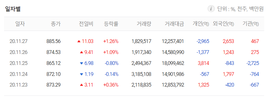 코스닥에도 11월 중순 들어 외국인이 매수 우위를 보이면서 그 전주 대비 15.38포인트(1.77%) 오른 885.56에 장을 마감했습니다.