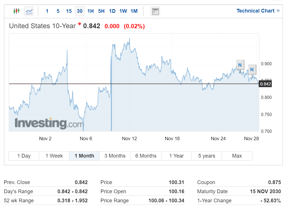 백신 개발의 기대감에 따른 미국 채권 가격의 등락에 따라 채권 수익률도 구간 변동성을 보였으나 다시 하락하면서 현재 0.842%를 기록 중입니다.