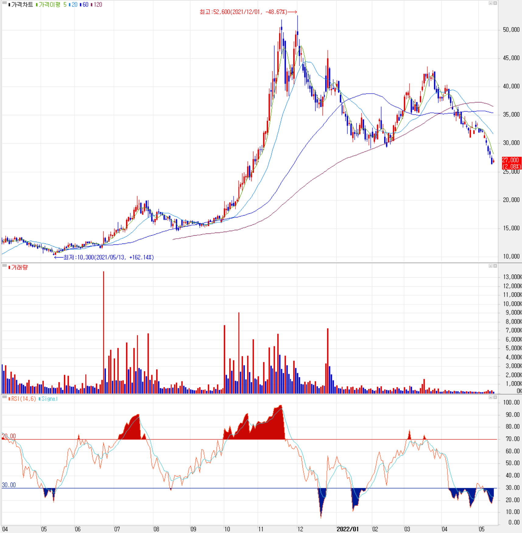5월 13일 장 종료 기준 당사의 주가는 전일보다 2.08% 오른 27,000원에 거래를 마쳤습니다. 외국인 비중은 7.05%이며, 시가총액 1조 1,538억 원으로 코스닥 시총 기준 40위 종목입니다.