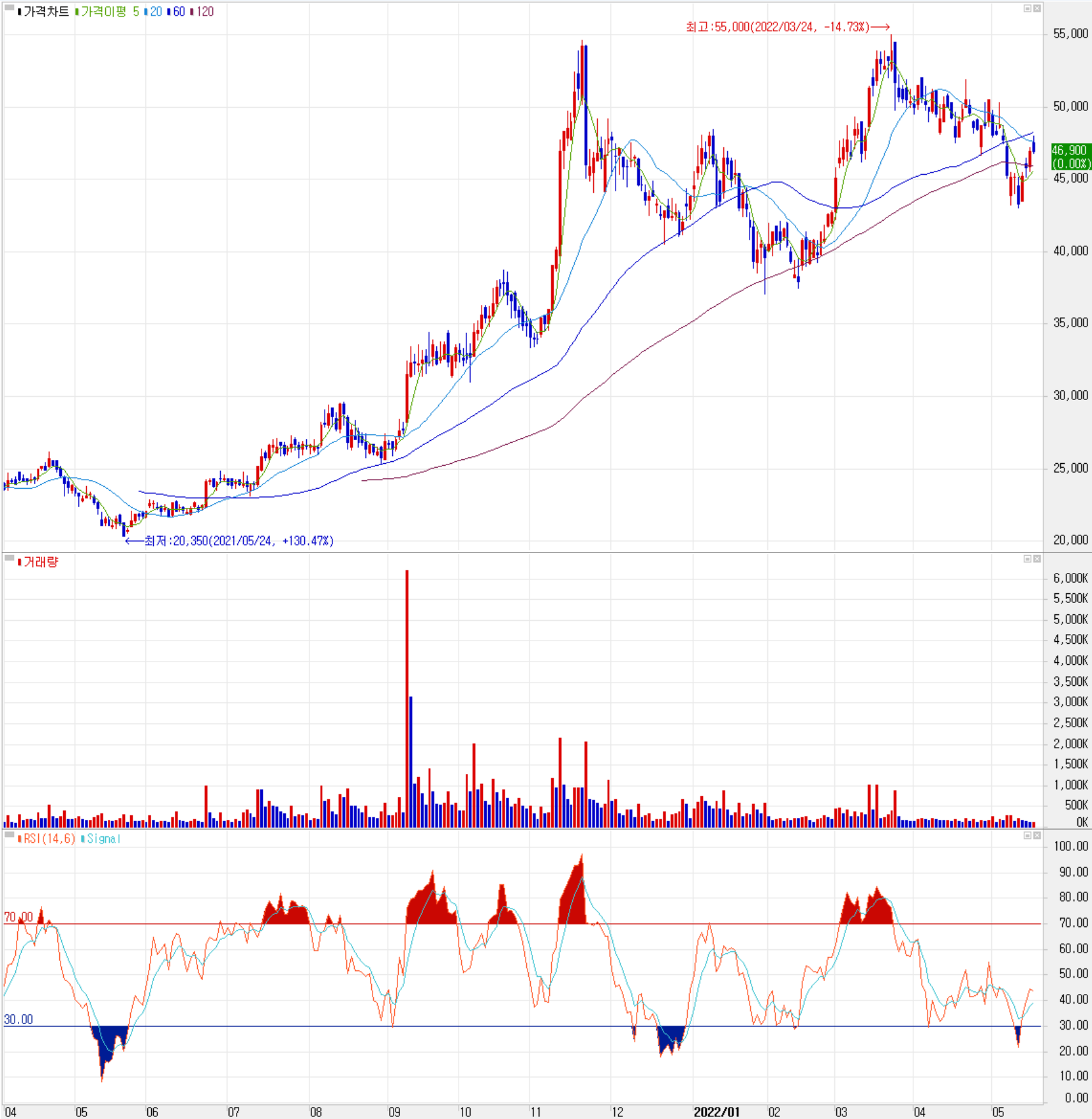 당사의 주가는 최근 들어 인플레이션 이슈 등 시장 불확실성으로 조정을 받으면서 한때 45,000원 아래로 내렸다가 5월 들어 반등하면서 4만 원대 중반에서 거래되고 있습니다. 사업 전망 및 차트 소견을 종합한 개인적인 목표주가는 지난번과 같은 56,000원으로 설정하였습니다. 1분기 중 수주액이 3,827억 원에 이르면서 총 수주잔고 1조 2,871억 원을 기록하는 등 당분간 꾸준한 성장을 예상하고 있습니다.
