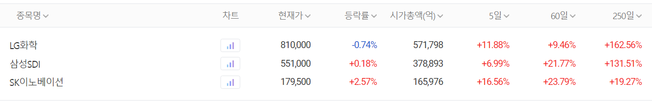 전기차 배터리(2차전지) 3사의 경우 LG화학과 삼성SDI에 대한 외국인의 순매수는 꾸준했습니다. 반면, SK이노베이션은 기관의 매수가 유입되면서 전반적으로 배터리 3사 모두 크게 상승하는 모습이었습니다.