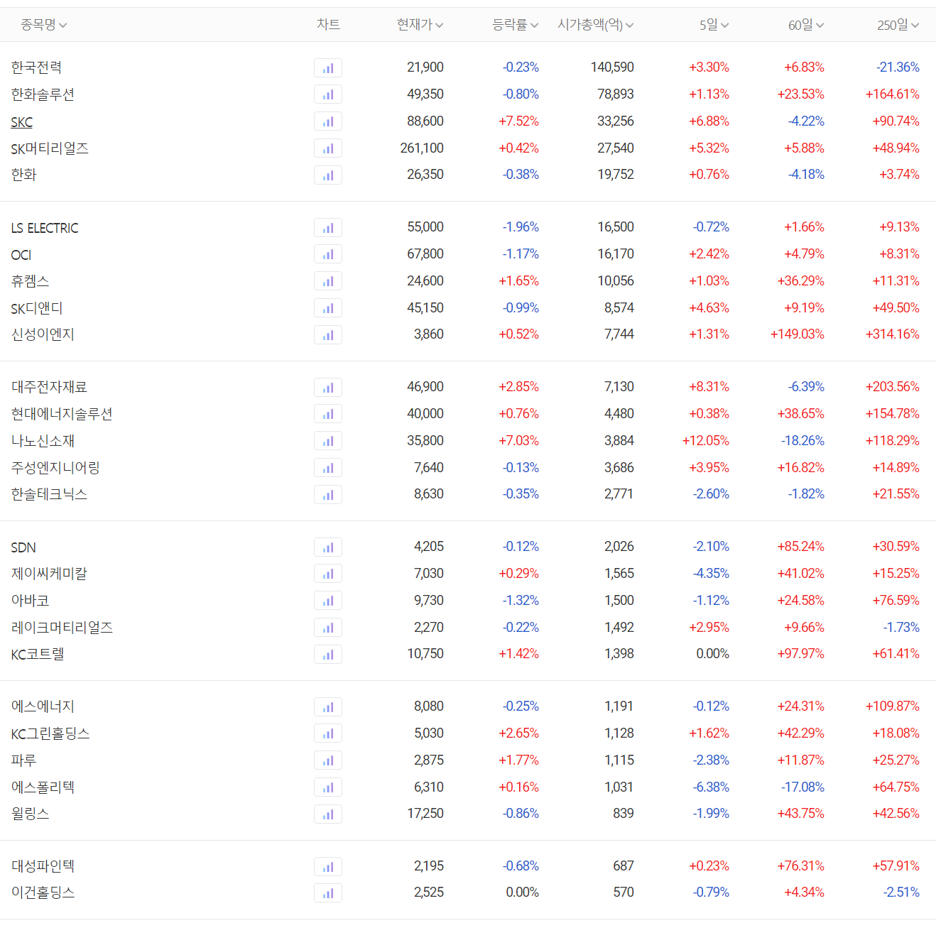 수소 관련 이벤트가 크게 없는 가운데 두산퓨얼셀(+16.73%)은 코스피200 지수 편입으로 상승했고, 삼화전자(+29.81%)는 테슬라 관련주로 관심받으면서 급등했습니다.