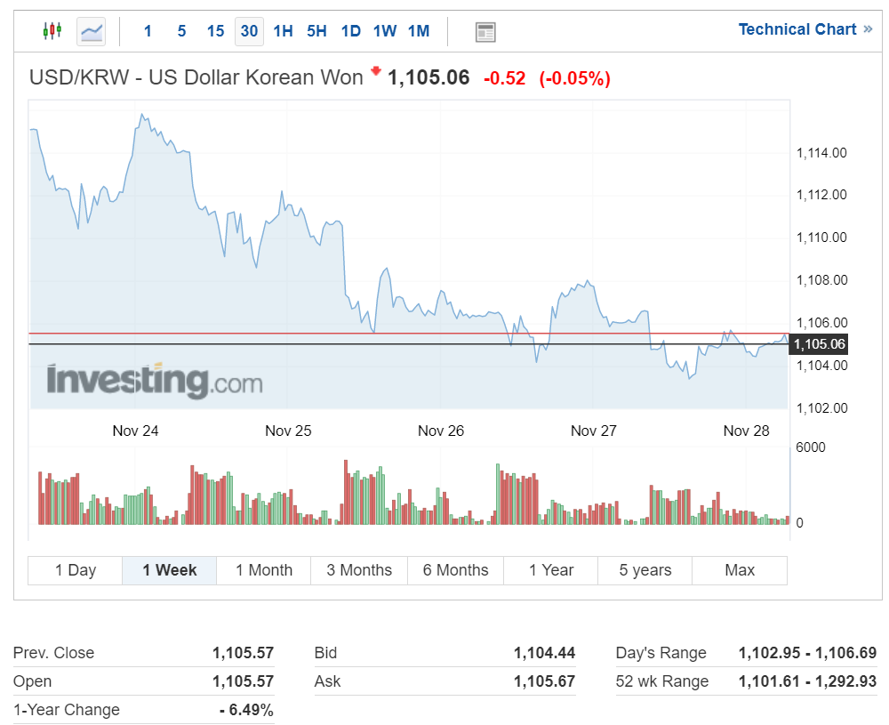 역외 원달러 환율은 1달러당 1105.06원을 기록 중입니다.