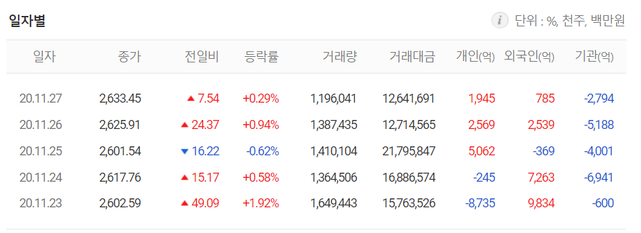지난주 코스피는 11월 27일 종가 기준 2일 연속 사상 최고치를 기록하면서 그 전주 대비 79.95포인트(3.13%) 오른 2633.45에 장을 마쳤습니다.