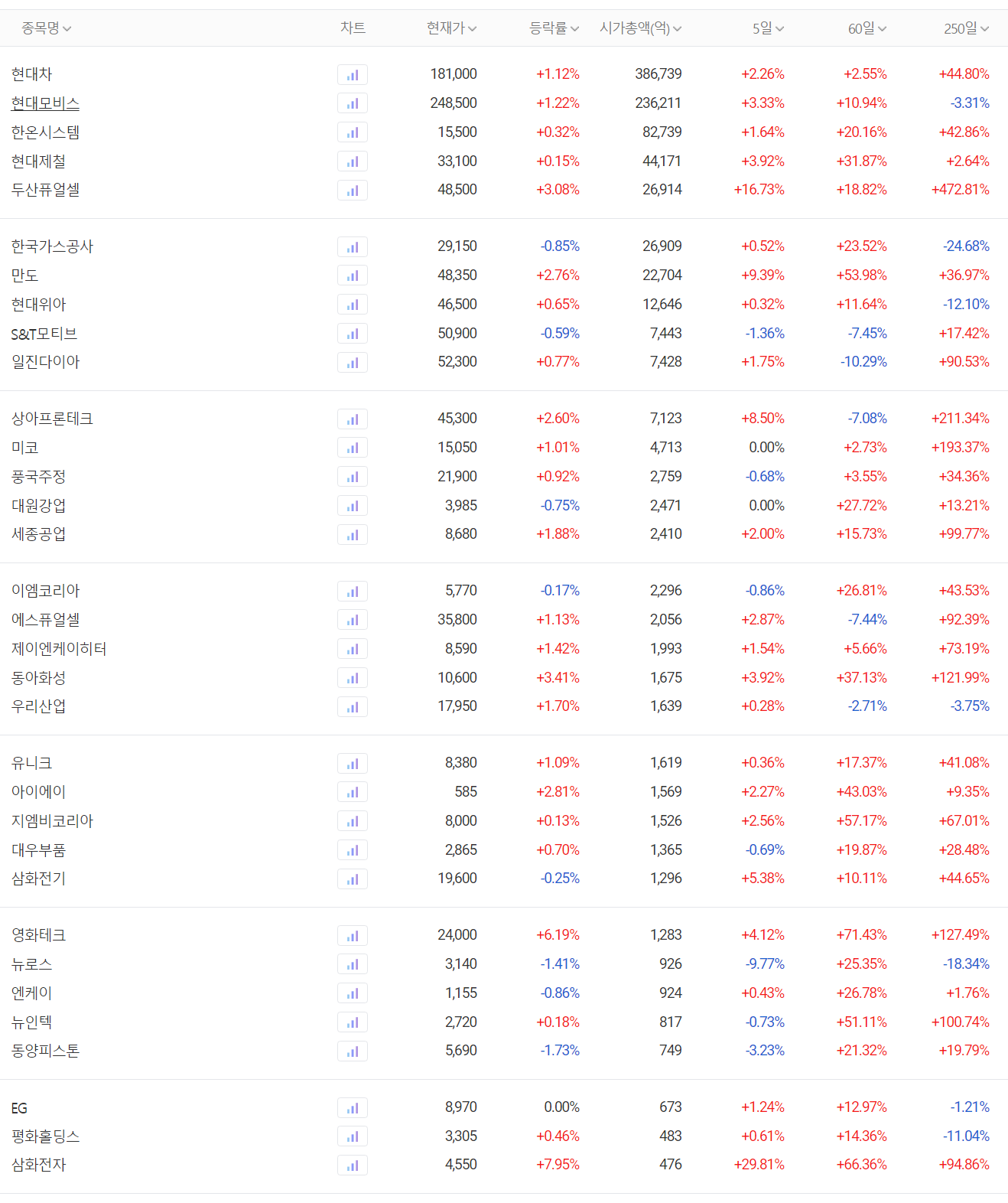 수소차(수소 연료 전지) 관련주 대장주 주간 시황