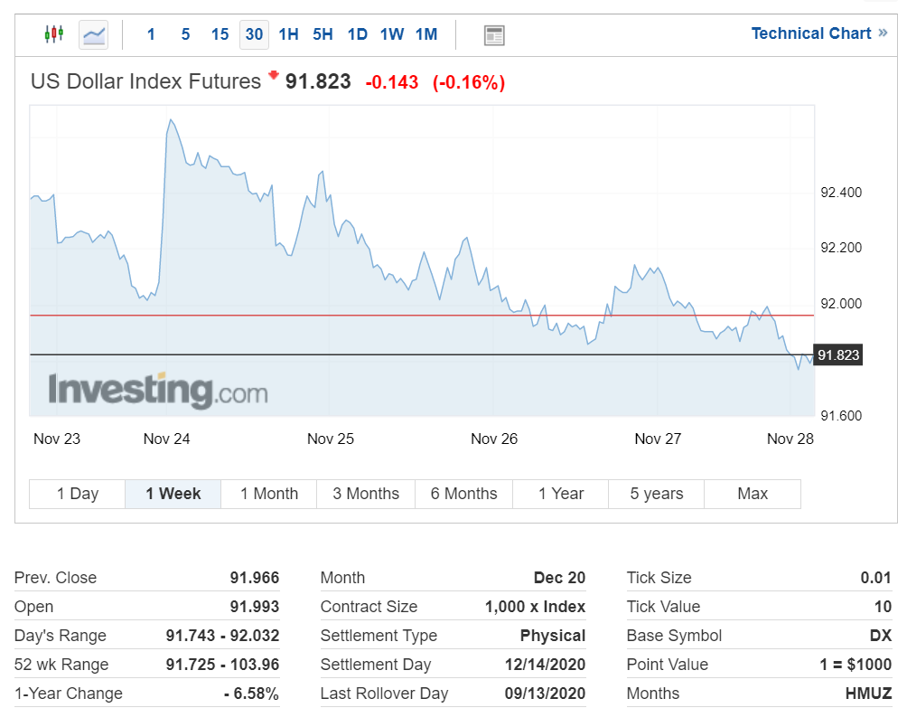 미국 달러 인덱스 선물은 주초반 92포인트에서 91포인트 대로 하락하며 현재 91.823포인트를 기록 중입니다.