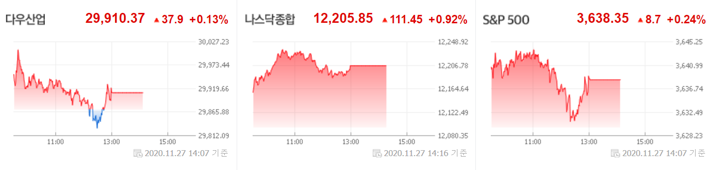 지난주 금요일 밤 뉴욕 증시는 블랙프라이데이 등을 맞아 연말 소비를 통한 기대감과 지속되는 코로나19 백신 개발 및 내부 정치적 불확실성이 해소되면서 3대 지수 모두 상승 마감했습니다.