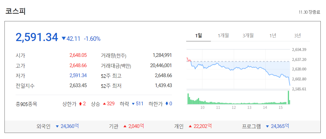 오늘 코스피는 역대 최고의 외국인 매도와 개인의 매수로 전 거래일 대비 42.11포인트(1.60%)하락한 2591.34에 마감하며 2600선 밑으로 내려갔습니다. 외국인의 매물 출하에 대한 주요인은 MSCI 지수 편출입에 의한 리밸런싱 이슈라고 합니다.