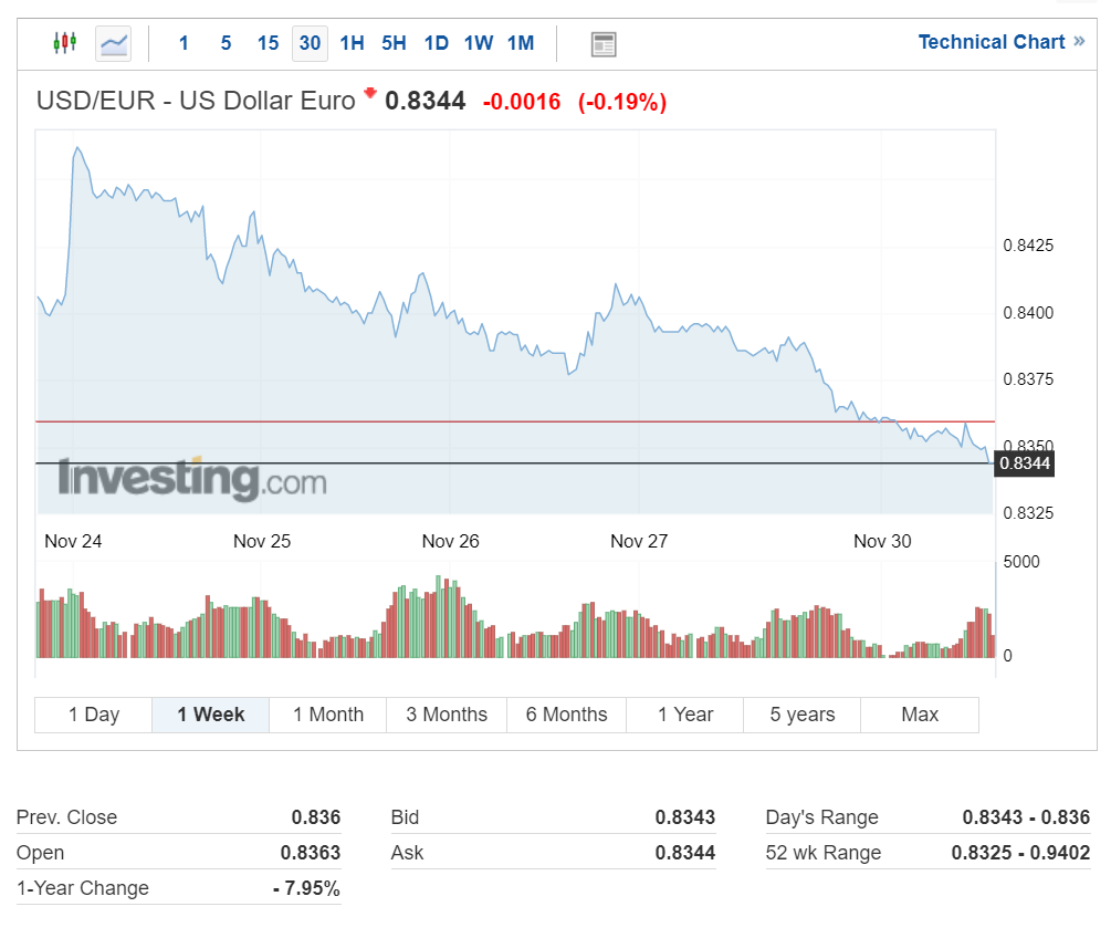 유로화는 오늘 강세를 보이면서 현재 1달러당 0.8344유로를 기록 중입니다.
