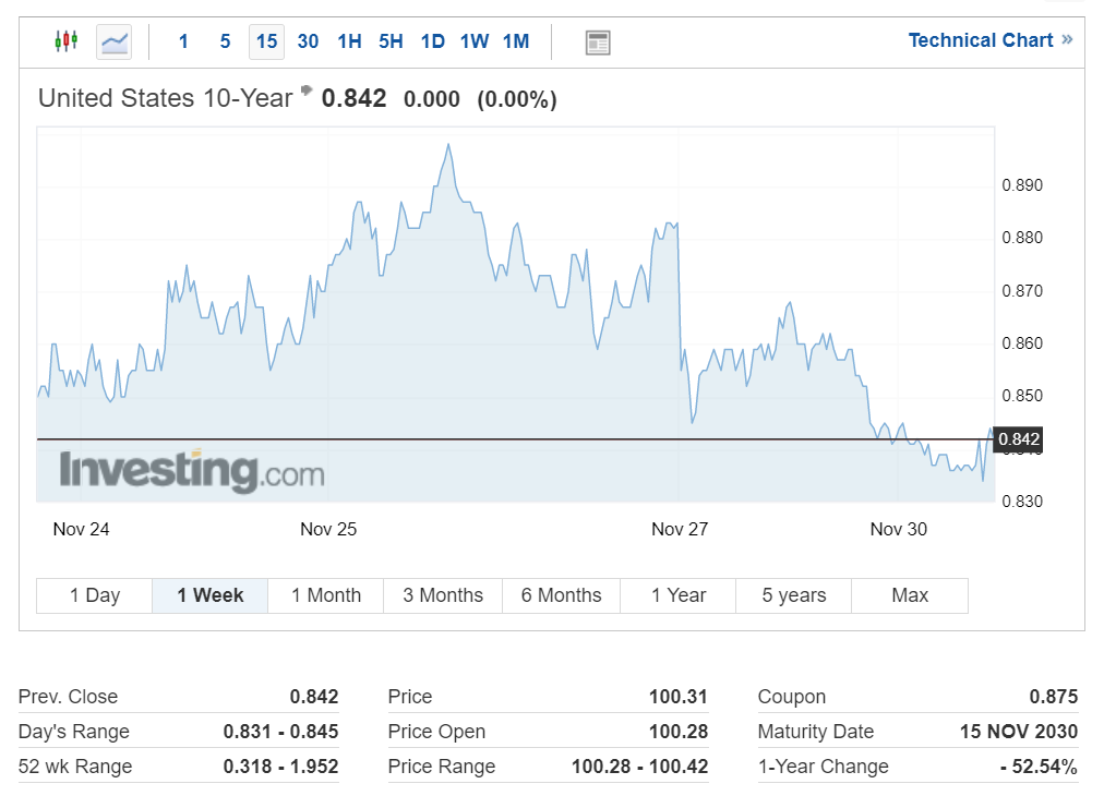 미국 국채 10년 물 금리는 지난 금요일에 이어 소폭 하락하면서 현재 0.842%를 기록 중입니다.