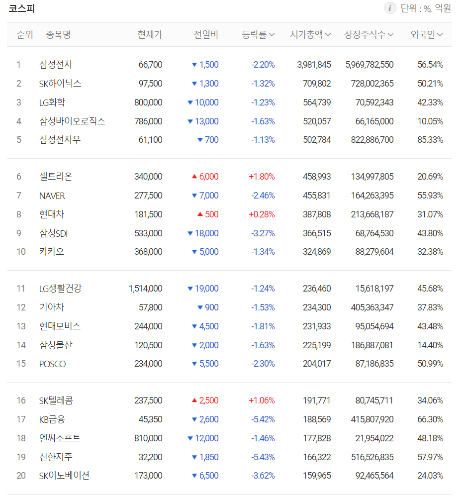 시가총액 상위 20개 종목 중에서는 트리온(+1.80%), 현대차(+0.28%) 및 SK텔레콤(+1.06%)이 상승했으나, 삼성전자(-2.20%), SK하이닉스(-1.32%), LG화학(-1.23%), 삼성바이오로직스(01.63%) 등 대부분의 종목이 하락했습니다.