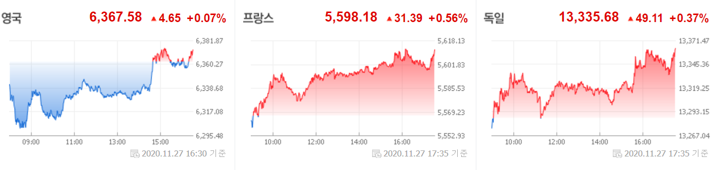 코로나19 백신의 기대감과 미국 내 정치적 불확실성이 점차 해소되는 와중에 영국과 프랑스 등은 1일 확진자 수도 감소 추세를 보이는 등 봉쇄에 따른 효과가 나타나는 모습이었습니다. 지난주 금요일 유럽 주요국 들의 증시는 강보합에 마감했습니다.
