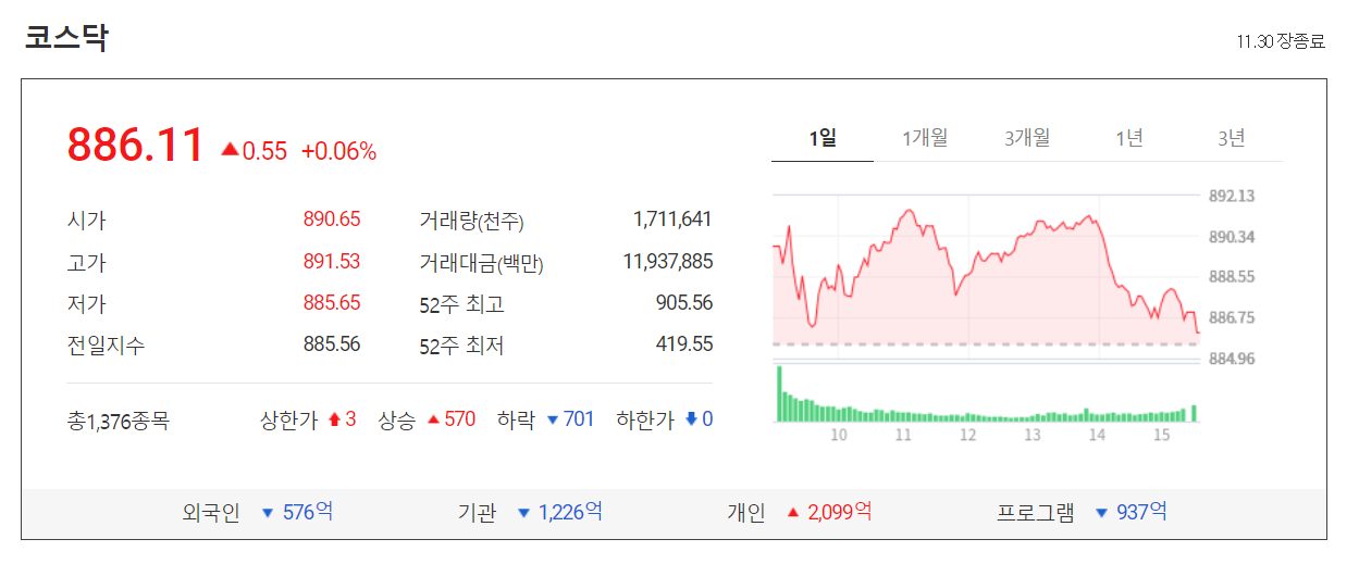 오늘 코스닥은 전장 대비 0.55포인트(0.06%) 오른 886.11에 장 마감했습니다.