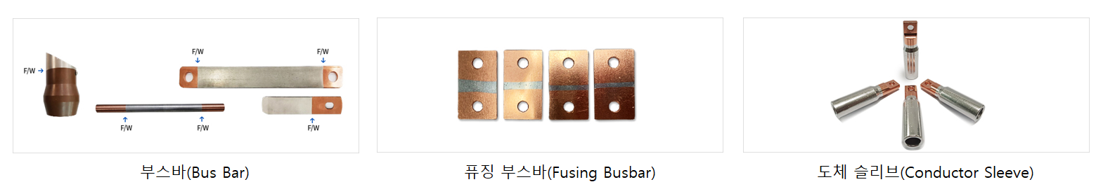 부스바에는 위의 표처럼 크게 4가지로 나뉘게 되며, 그 중 당사가 개발한 ACF부스바는 알루미늄 방의 양쪽에 구리를 마찰 용접한 후 다시 압착시켜 개발 한 제품으로서, 기존 구리에 비해 자동차 경량화에 유용하며 알루미늄의 사용으로 원가절감에도 기여할 수 있으나 순수 구리에 비해 도전율이 떨어지는 것이 아쉽습니다.