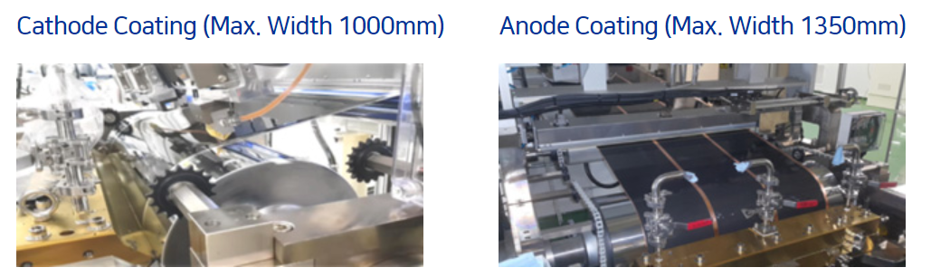 리튬 이차전지에서 전극을 제조하는 공정에서 가장 중요한 장비입니다. 코팅이란 전극의 집 전체 역할을 하는 기재(Substrate: AL or Cu Foil)에 활물질, 도전재, 바인더 및 용제로 구성 된 슬러리를 일정한 두께(밀도)로 코팅 후 건조하여 전극을 제조하는 공정입니다. 이차전지의 파우치형, 테슬라 전기자동차에 주로 사용하는 원통형 등 다양한 형태의 이차전지에 코팅을 할 수 있는 장비입니다.