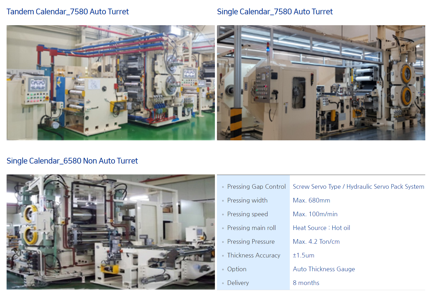 당사는 이차전지 생산에 필요한 공정 중 전극제조에 관련된 장비를 전문적으로 제조하는 업체로서, 전극제조 공정에 해당되는 장비는 Coater, Calendar, Slitter, Tape Laminator 등이 있습니다.