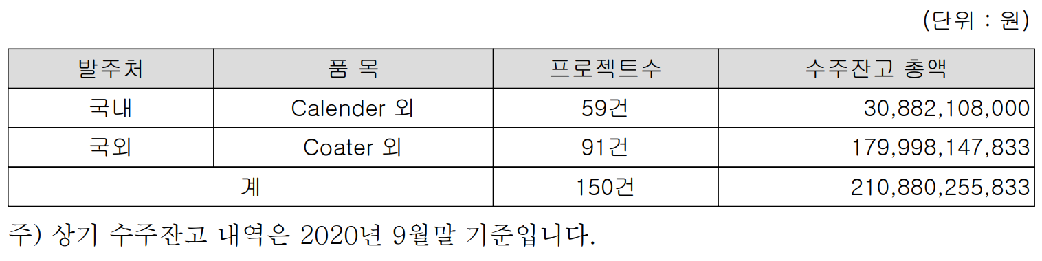 현재 당사의 국내외 수요에 따른 수주 잔고는 2020년 9월 말 현재 2108억 원이며 자세한 내역은 아래와 같습니다.