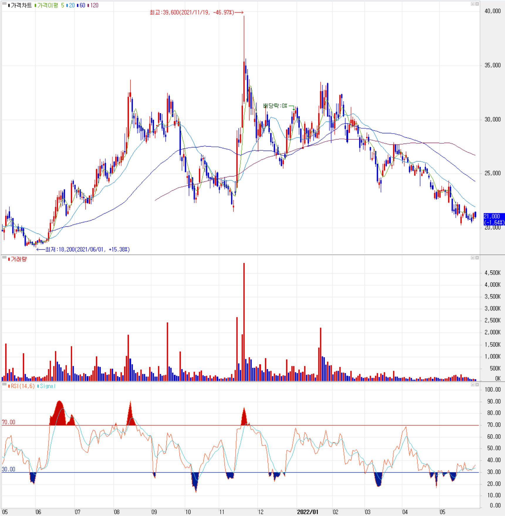 5월 31일 장 종료 기준 당사의 주가는 전일보다 1.64% 내린 21,000원에 거래를 마감했습니다. 외국인 비율은 1.23%이며, 시가총액 3,859억 원으로 코스닥 시총 기준 216위 종목입니다.