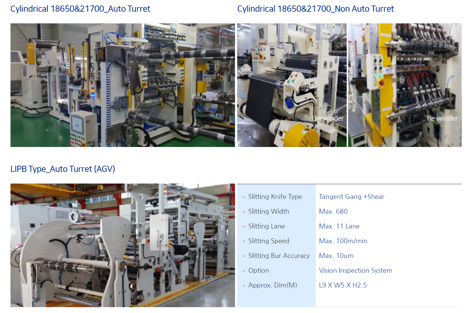 당사는 이차전지 생산에 필요한 공정 중 전극제조에 관련된 장비를 전문적으로 제조하는 업체로서, 전극제조 공정에 해당되는 장비는 Coater, Calendar, Slitter, Tape Laminator 등이 있습니다.