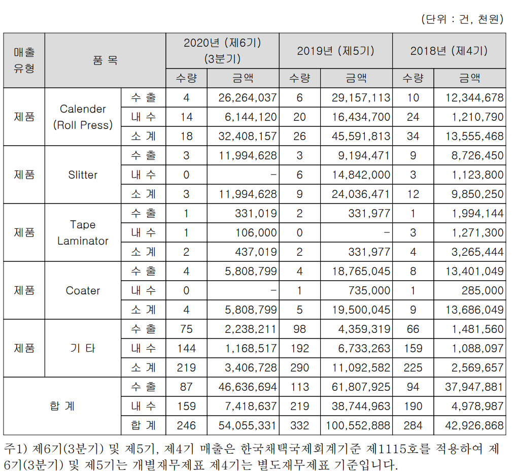 2020년 3분기 기준 주요 제품 별 매출 구조를 보면, Calendar가 전체 매출의 60% 가까이 차지하고 있으며 Slitter, Tape Laminator, Coater 순으로 매출이 일어났습니다.