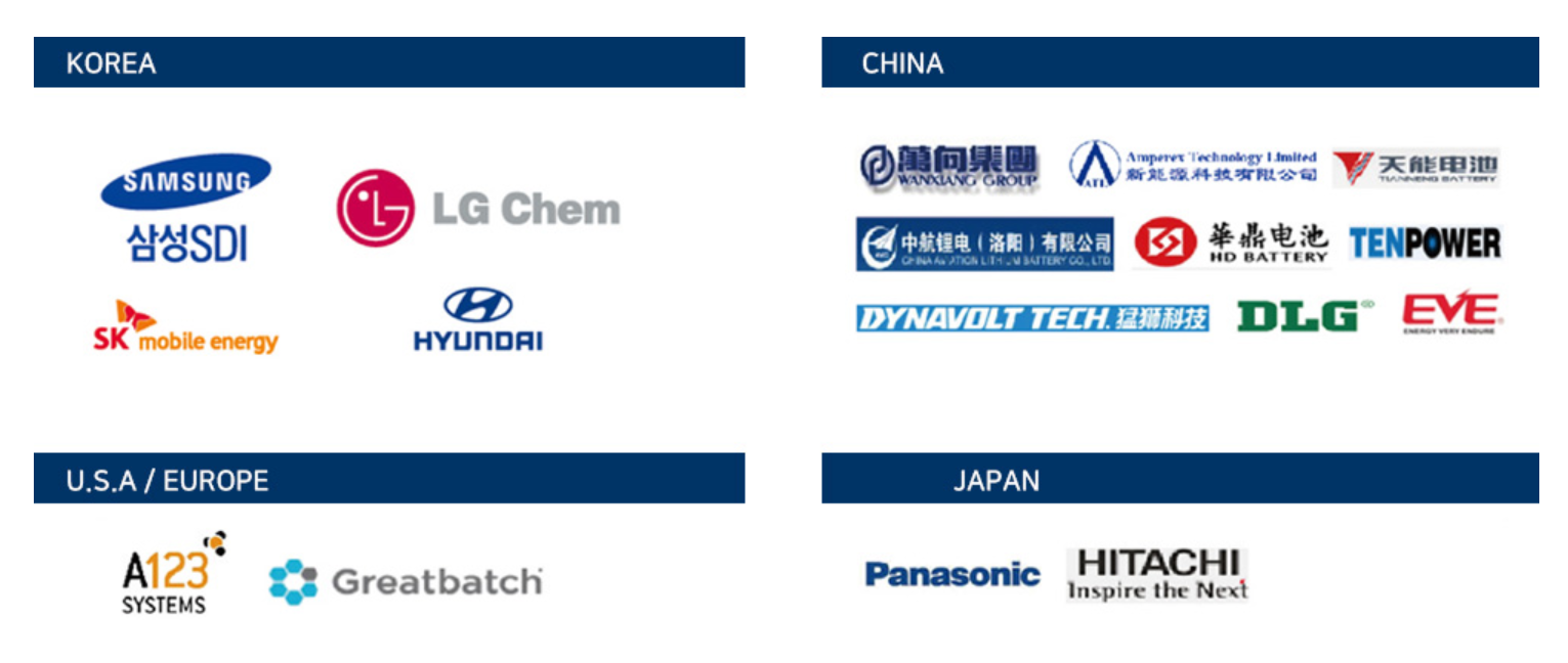 국내 LG화학, 삼성SDI 그리고 중국의 Wanxiang 등과 스웨덴 노스볼트, 일본의 파나소닉, 히다찌 등과 거래 이력이 있습니다. 현재는 국내 배터리 3사와 중국향 매출이 전체의 80% 이상을 차지하고 있습니다.