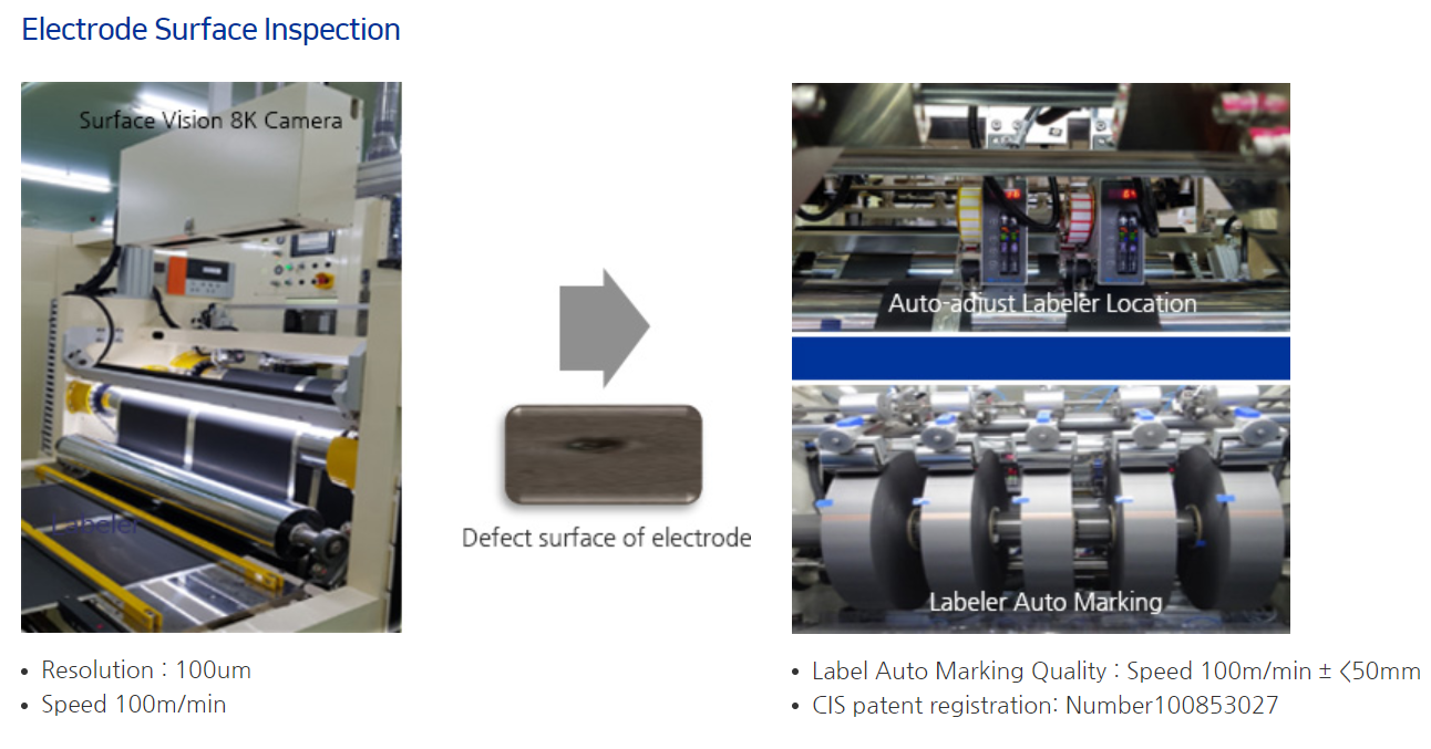 특히 슬리팅 절단 품질은 전지 안전성 보증에 가장 큰 영 향을 미치는 품질 요소 입니다. 당사 슬리팅 장비의 장점은 압연된 전극표면의 흠집 등을 자 동으로 감지해서 식별할 수 있는 비전장치와 흠집 부위에 자동으로 라벨을 마킹하는 장치가 있으며 이 장치는 매우 컴팩트한 디자인 및 간단한 신호 체계로 작동 할 수 있도록 설계되어, 슬리팅 공정 외에도 컨버팅 전체장비에 판매 되고 있습니다.