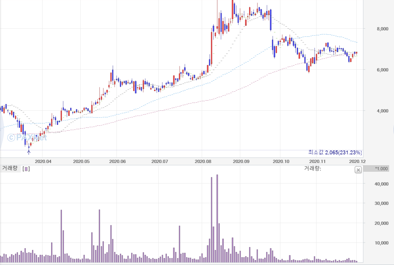 지난 8월 부터 9월에 걸쳐서 전기차 배터리 테마와 함께 급상승했던 당사의 주가는 10월 초 조정을 거치면서 12월 1일 종가 기준 6,840원을 기록했습니다. 단기적 주가의 방향은 전년 동기 실적에 따라 단기적으로는 6000원대 초반에서 7천원대 중반사이를 오갈 것 같습니다.