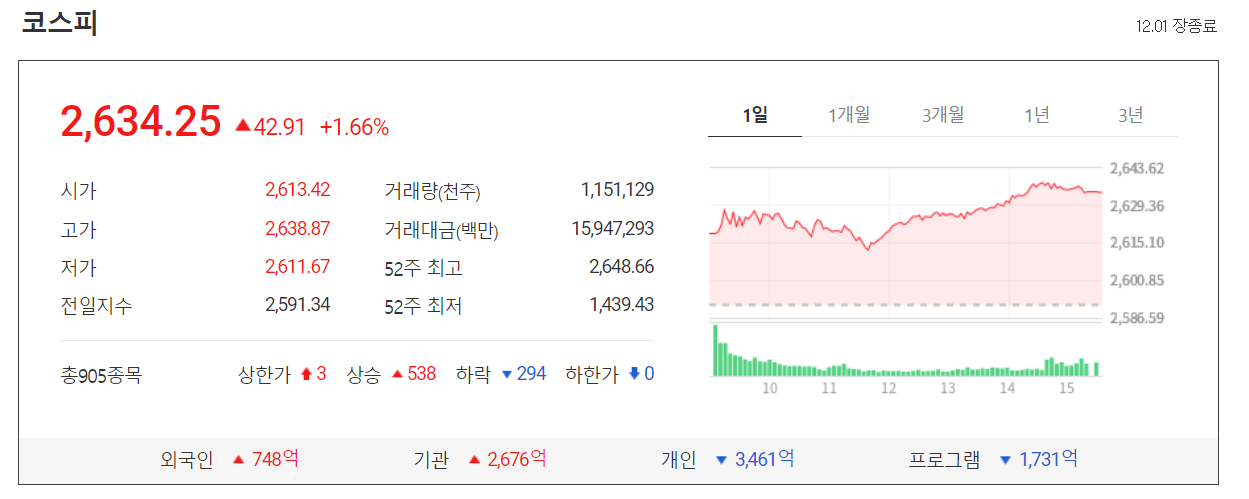 오늘 코스피는 어제보다 42.91포인트(1.66%)오른 2634.25에 장을 마치며 또다시 사상 최고치를 경신했습니다. MSCI 지수 리밸런싱으로 예상됐던 어제의 대규모 매도세에 오늘도 시장에서는 외국인의 행보가 주목되었으나 일반적인 예상대로 다시 매수세로 돌아선 것 같습니다.