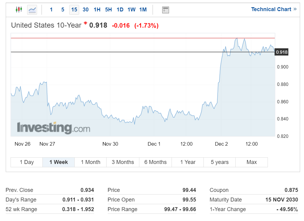 미국 10년 만기 국채 수익률은 경기 부양책 기대감에 따라 크게 상승하면서 현재 0.918%를 기록 중입니다.