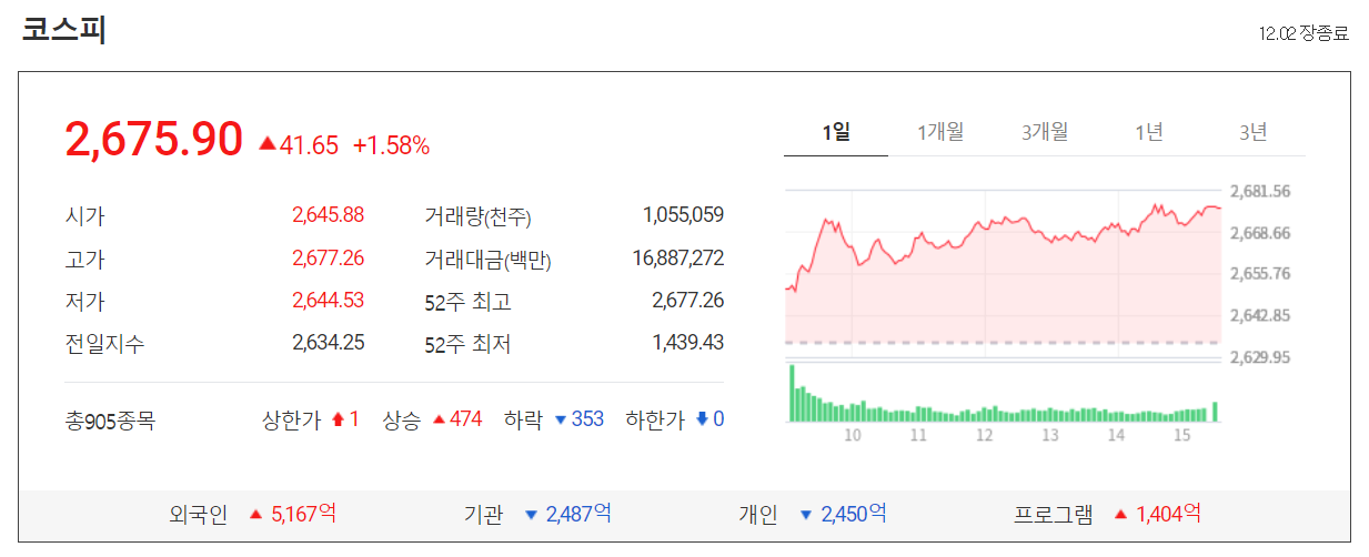 오늘 코스피는 백신의 기대감과 미국 경기 부양책 논의 재개에 대한 소식과 달러 약세 등으로 이틀 연속 사상최고치를 경신하면서 전일 대비 41.65포인트(1.58%) 오른 2675.90에 장을 마감했습니다.