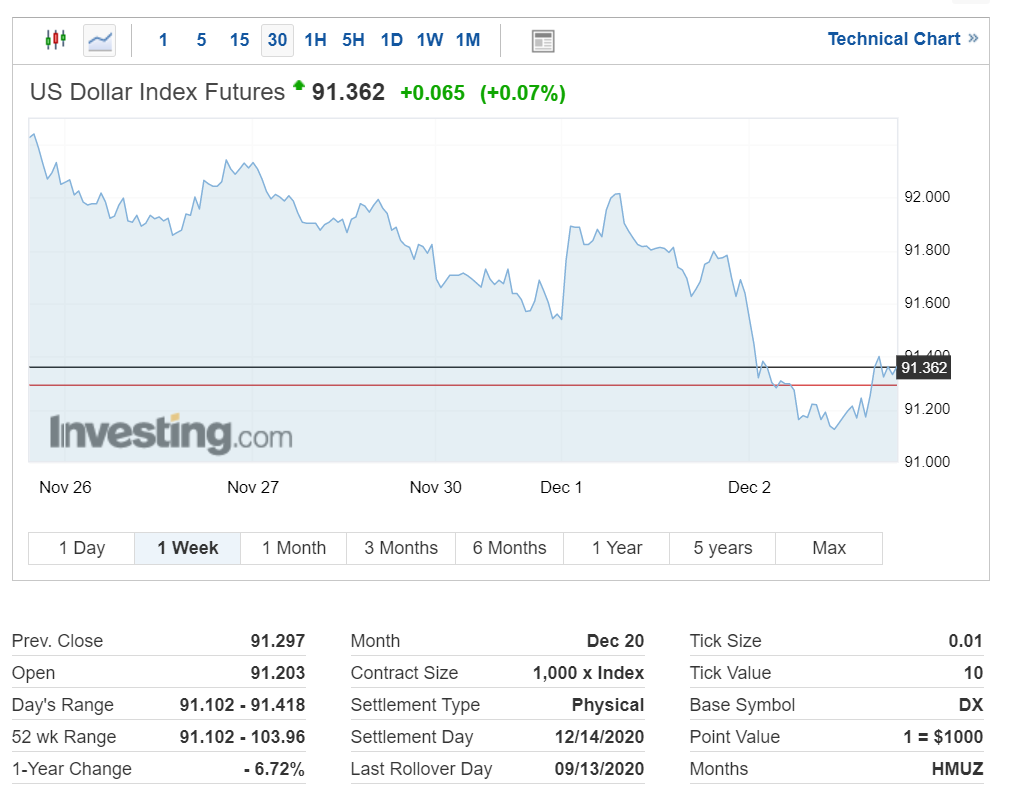미국 달러 인덱스는 한 때 2018년 초 이래 최저치에 근접했으나 현재 소폭 상승하면서 91.362포인트를 기록 중입니다.