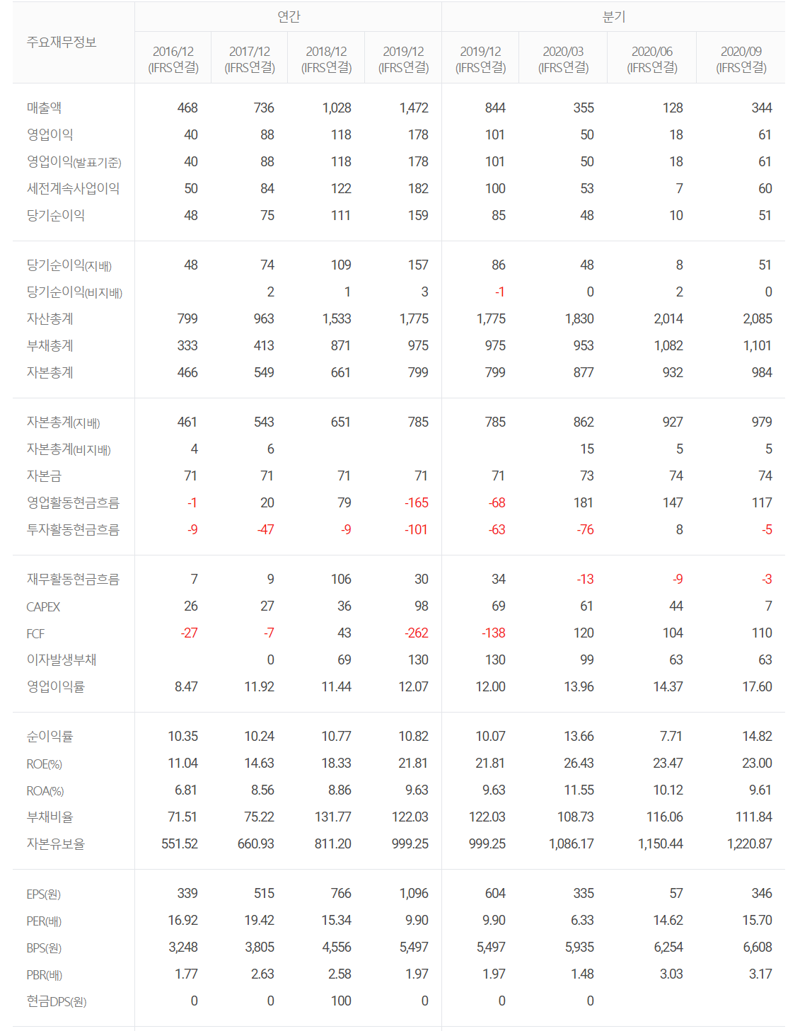 (시가총액은 2020년 12월 2일 종가 기준, EPS/PER은 3분기 결산 기준)