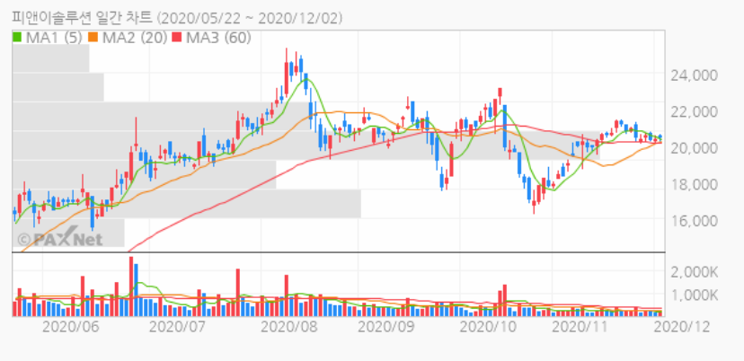 피앤이솔루션 일봉 차트입니다. 대폭락이 있었돈 3월 19일 연중 최저가인 6250원에서는 3배가 넘게 올랐으나 연고점 대비 20% 가까운 조정을 맞고 있습니다. 2분기 저조한 실적과 10월과 11월에 걸친 성장주들의 조정에 따른 하락으로 풀이됩니다. 또한 10월에는 원익IPS로 대주주 변경 건이 공시되면서 주가하락을 키웠다가 일부 회복하는 모습입니다.