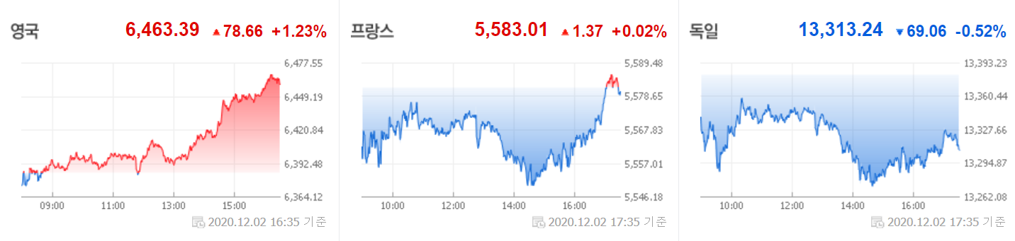 간밤에 영국 정부는 화이자-바이오엔테크의 백신 사용을 승인하면서 경기 회복에 대한 현실적 기대감에 시장이 호응했습니다. 반면 프랑스와 독일은 큰 움직임 없어 보입니다.