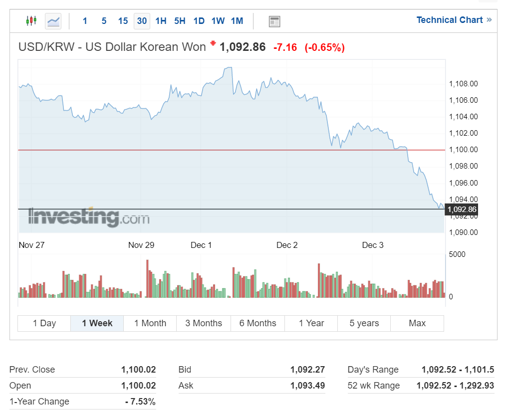 현재 역외 시장에서는 20:00 현재 1달러당 1092.86에 거래되면서 하락 폭을 키우는 중입니다.