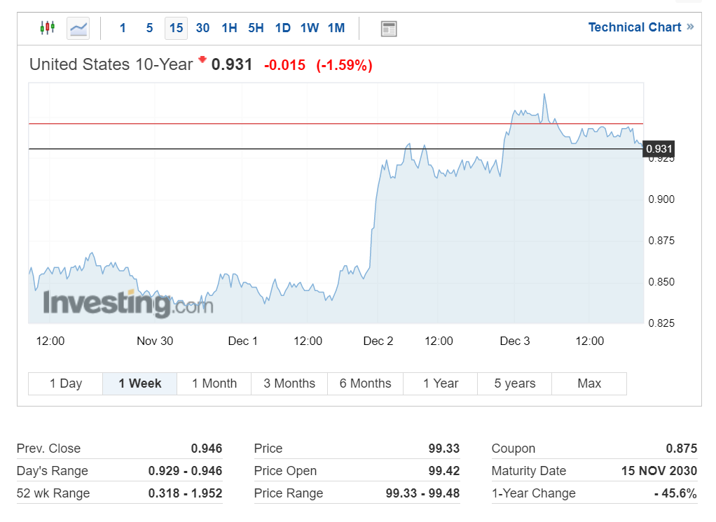 미국 10년 만기 국채 수익률은 어젯밤 미국 의회의 경기 부양책 합의 기대감 및 파월 연준 의장의 유동성 공급 지원 발언에 따라 국채 가격은 하락했고, 현재 수익률은 0.931%를 기록 중입니다.