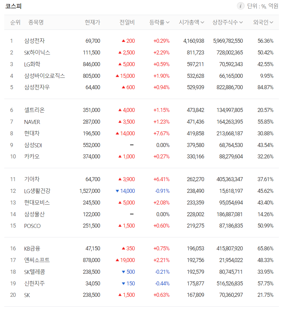 오늘 시가총액 상위 10개 종목 모두 오르면서 지수 상승을 이끌었습니다.