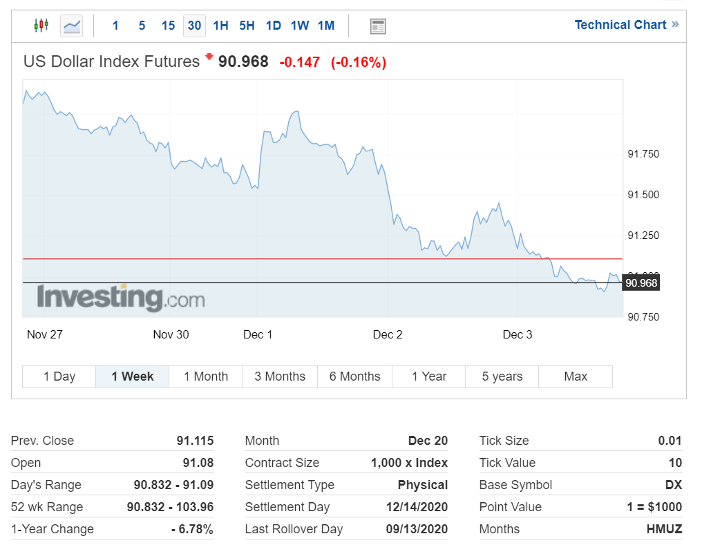 미국 달러 인덱스는 유로화 강세의 지속에 따라 91포인트 대도 밀리면서 현재 90.968을 기록 중입니다.