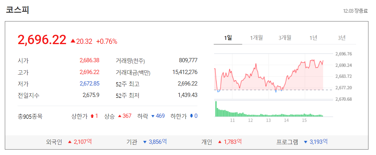 오늘 코스피는 3 거래일 연속 상승하면서 어제 보다 20.32포인트(0.76%) 오른 2696.22에 마감되었습니다.