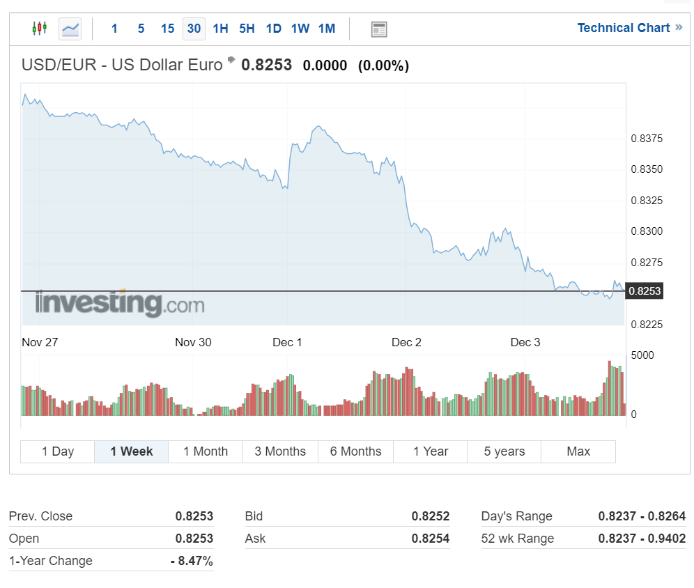 유로화 강세가 지속되면서 현재 1달러당 0.8253 유로를 기록 중입니다.