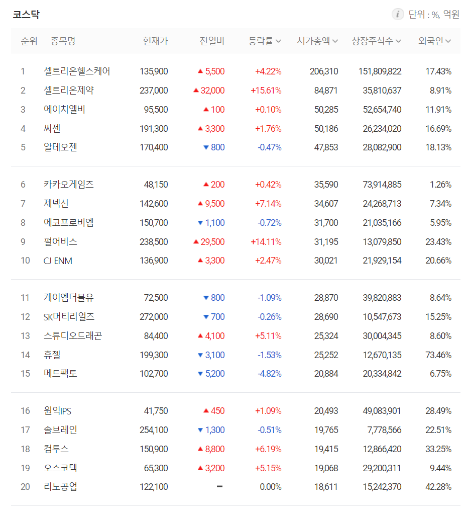 시가총액 상위 종목 중에서는 셀트리온헬스케어(+4.22%), 셀트리온제약(15.61%), 에이치엘비(+0.10%), 씨젠(+1.76%), 카카오게임즈(+0.42%), 제넥신(+7.14%), 펄어비스(+14.11%), CH ENM(+2.47%) 등이 상승했으며, 알테오젠(-0.47%), 에코프로비엠(-0.72%)는 내렸습니다.